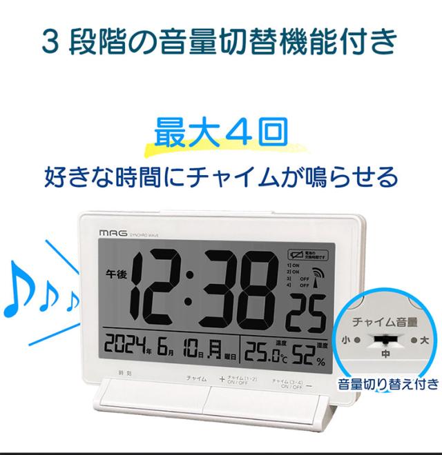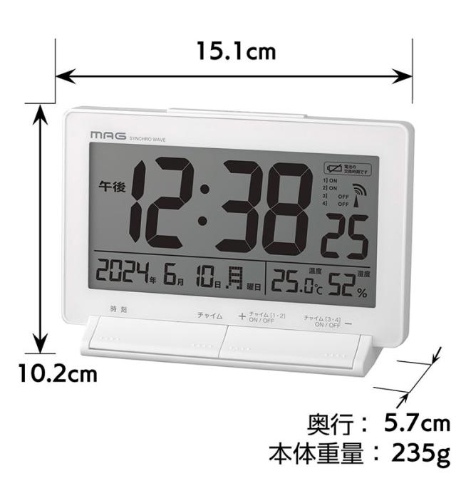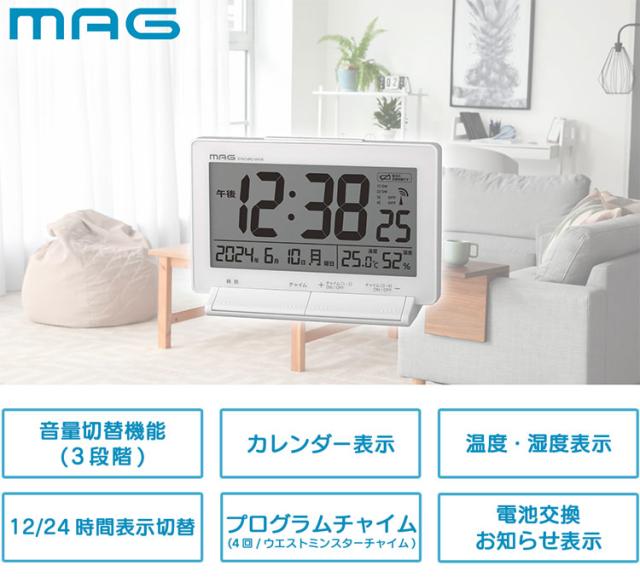 MAG(マグ) 置き時計 デジタル 電波時計 プログラム チャイム 4回 自由設定 音量切替 温度計 湿度計 温湿度計 カレンダー ライト ホワイト タイムチャイム T-792 WH-Z ノア精密【送料無料】