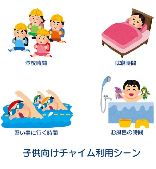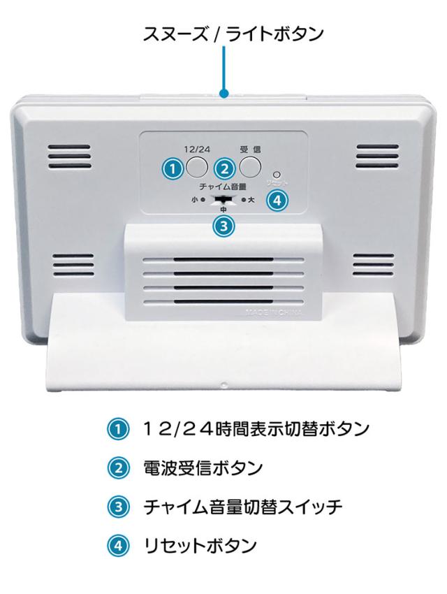 機能:電波時計(JJY)、時刻表示、カレンダー表示、温度/湿度表示、12/24時間表示切替、電池交換お知らせ表示、プログラムチャイム(最大4回)、音量切替、ライト