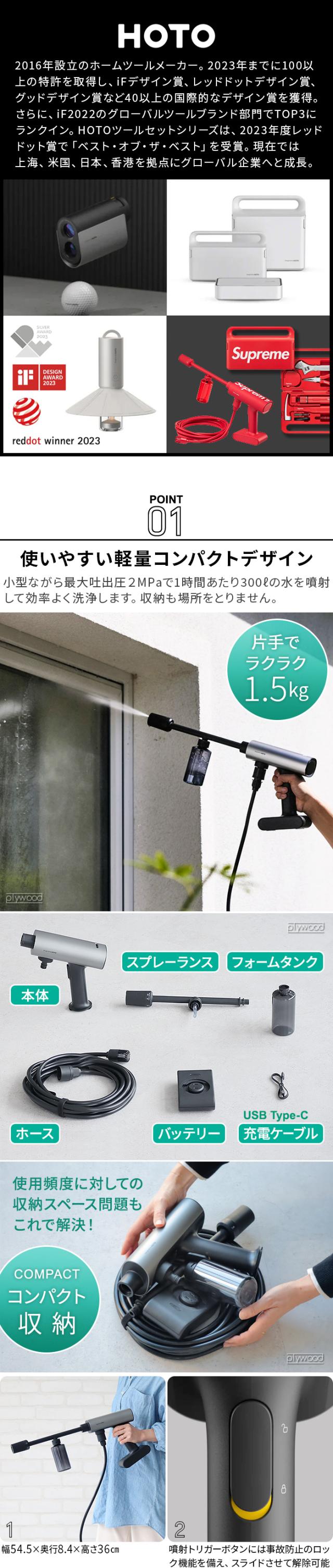現代のライフスタイルにぴったりな軽量コンパクトな充電式の高圧洗浄機のご紹介です。軽々と作業しやすく、収納時も驚くほどコンパクトに。充電式なので、電源を気にせず自由に使えるのも大きな魅力!水をはったバケツから付属の汲み取りホースで水を供給するので、庭や車、バルコニーなど、さまざまな場所で活躍します。調整可能なノズルにより、洗浄圧を自在にコントロールできるため、デリケートな表面から頑固な汚れまで幅広く対応可能。また、洗練されたデザインは洗車中のその姿さえもカッコよく演出してくれそうです。日常の掃除を楽しく、効率的にこなす頼もしいパートナーとしておすすめです。