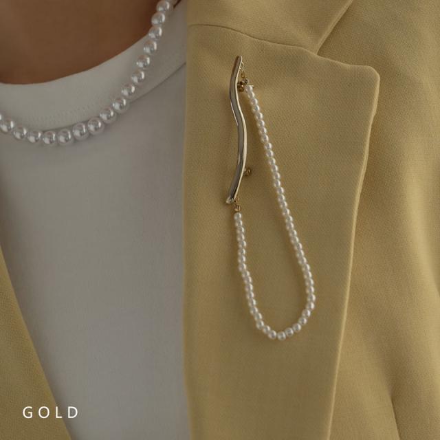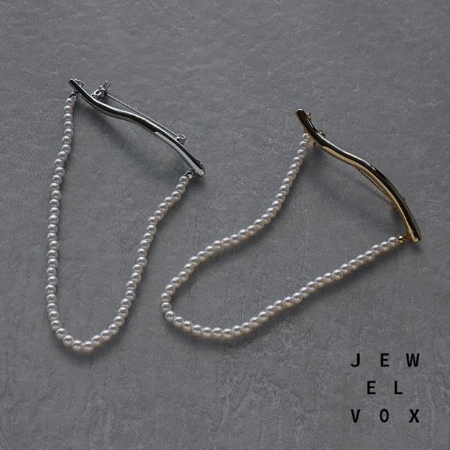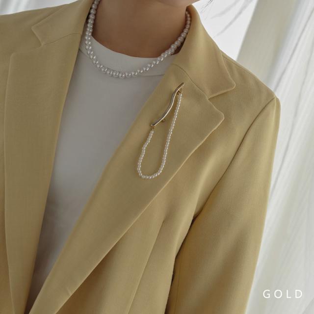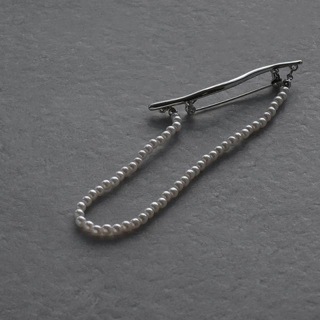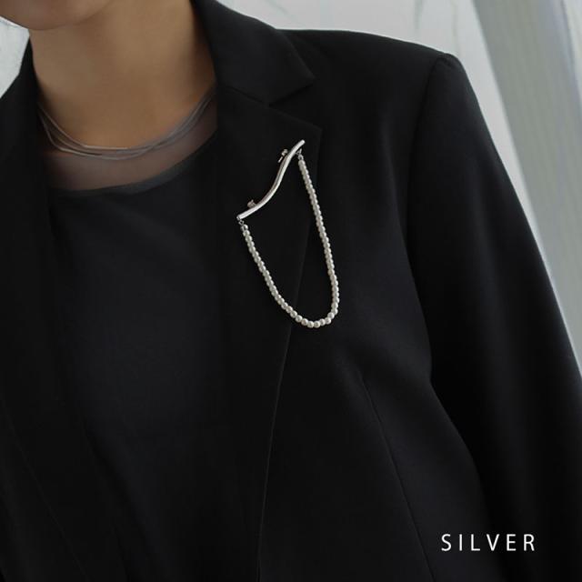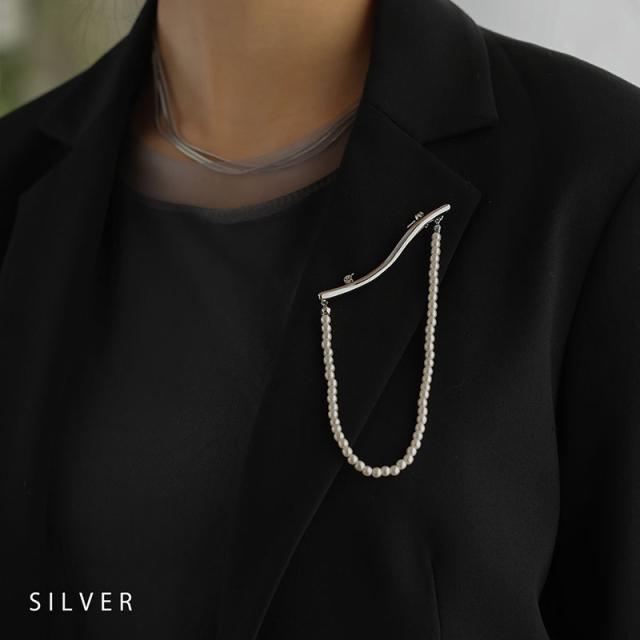 捻れメタルバーと連なったパールが胸元で揺れる、大人な雰囲気のブローチです。