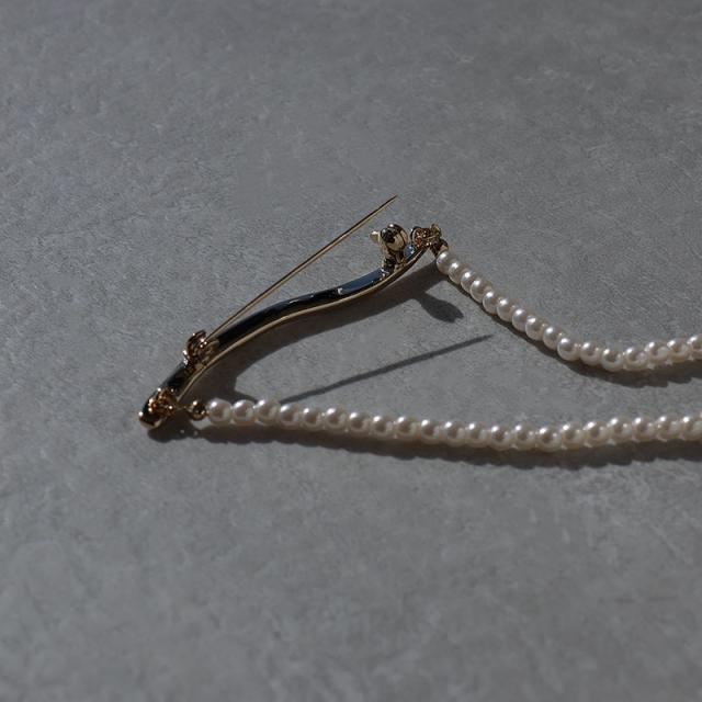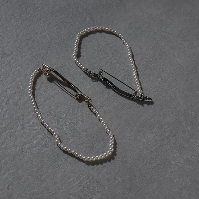 | 捻れメタルバーと連なったパールが胸元で揺れる、大人な雰囲気のブローチです。 バーの角度次第で、色んなパールチェーンの表情を楽しめます。 カジュアルからフォーマルまでさまざまなコーディネートのワンポイントとして活躍してくれます。 | |