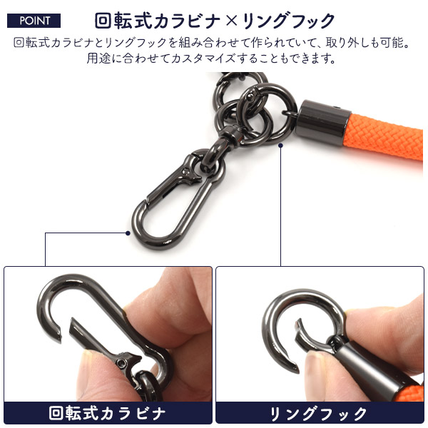 スマホホルダーや財布と組み合わせたり、様々な用途で活躍します。 約10mmの太めのストラップで耐久性があり、 長時間肩にかけたままでも、痛くなりにくくなっています。 回転式カラビナとリングフックを組み合わせて作られていて、取り外しも可能。 用途に合わせてカスタマイズができます。 レザーバンドに吊り下げて小物を装着することも可能です。 6色からお選び頂けます。 | ||||||||||