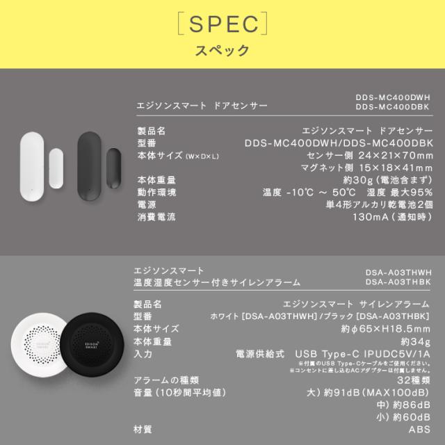 【ドアセンサー】 ホワイト[型番:DDS-MC400DWH] ブラック[型番:DDS-MC400DBK] 【サイレンアラーム】 ・ホワイト[型番:DSA-A03THWH] ・ブラック[型番:DSA-A03THBK] |