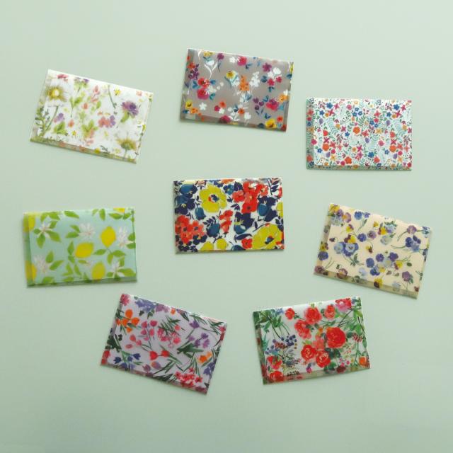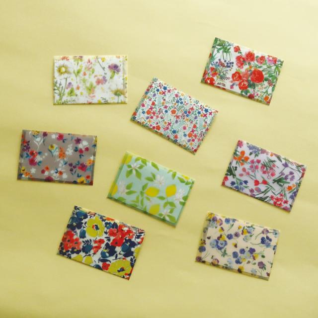 トレーシングペーパーに華やかな花柄をプリントした封筒は名刺が入るサイズです。