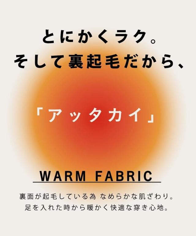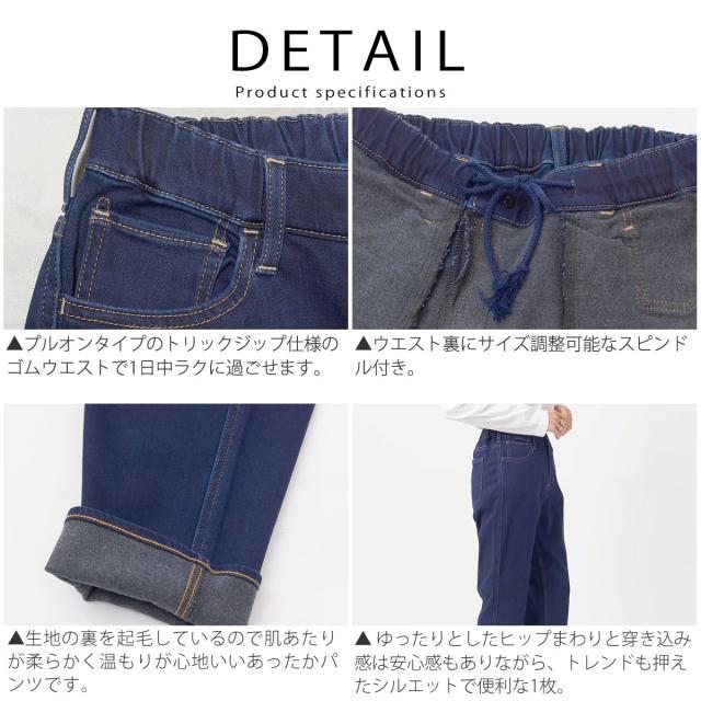 生地の裏を起毛しているので肌あたりが柔らかく温もりが心地いいあったかパンツです。