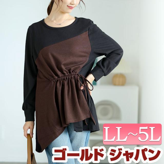春新作 大きいサイズ レディース トップス ニット ウエストシャーリングアシメトップス クルーネック 長袖 配色 切替え ウエストシャーリング リボン紐 アシンメトリー テールカット バイカラー 無地 薄手 カジュアル 春服 秋服 LL 2L 3L 4L 5L ブラック ゴー イベントセール