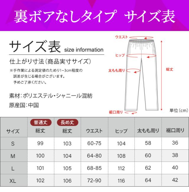【裏ボアなし】 S=総丈99(普通丈)、総丈103(長め丈)、ウエスト60-75、ヒップ104、太もも周り58、裾口 M=総丈100(普通丈)、総丈104(長め丈)、ウエスト64-80、ヒップ108、太もも周り60、裾口 L=総丈101(普通丈)、総丈105(長め丈)、ウエスト68-85、ヒップ112、太もも周り62、裾口 XL=総丈102(普通丈)、総丈106(長め丈)、ウエスト72-90、ヒップ116、太もも周り64、裾口 ※こちらのサイズは平置き実寸サイズです。同じ商品であっても素材、測る位置により1?3cm程度誤差が生じる場合がございます。 |
