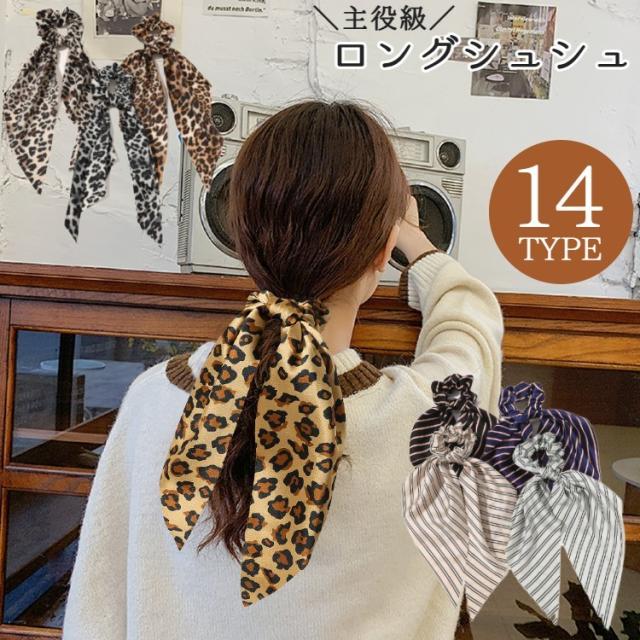 シュシュ ロング 主役級 ヒョウ柄 豹柄 レオパード レオパ ストライプ プリント レディース ヘアアクセサリー 髪飾り 髪留め
