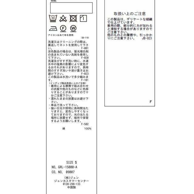 ■お手入:洗濯機|漂白不可|タンブル乾燥不可|自然乾燥|アイロン仕上げ可|ドライ可|ウエットクリーニング可