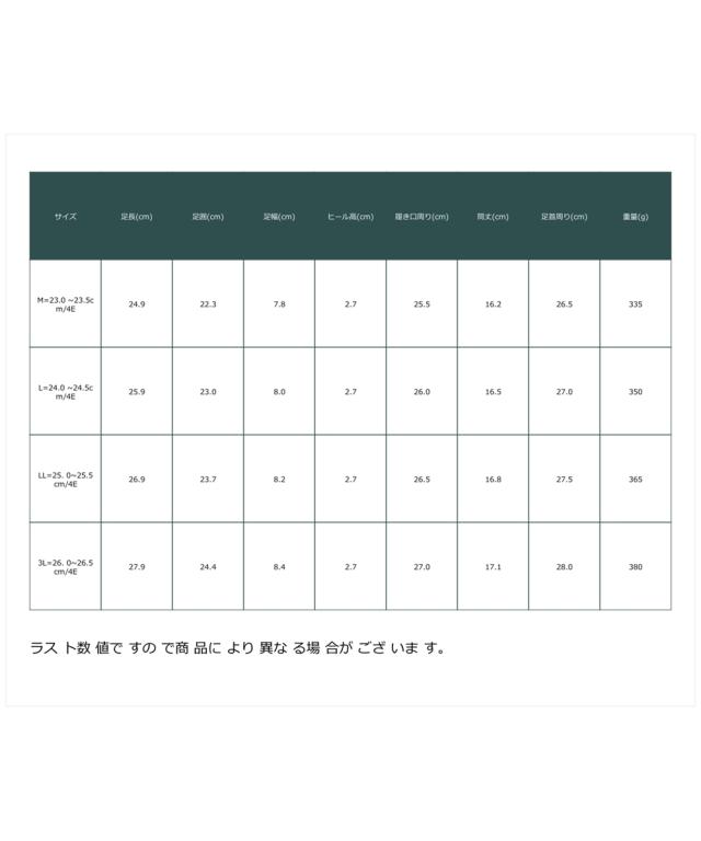 材質=合成皮革 底材=合成底 ヒール=約3cm ワイズ=4E 重量=約350g(Lサイズ片足) ※生産時期や素材などによって多少個体差がございます。後ろファスナー開き 原産国:中国製