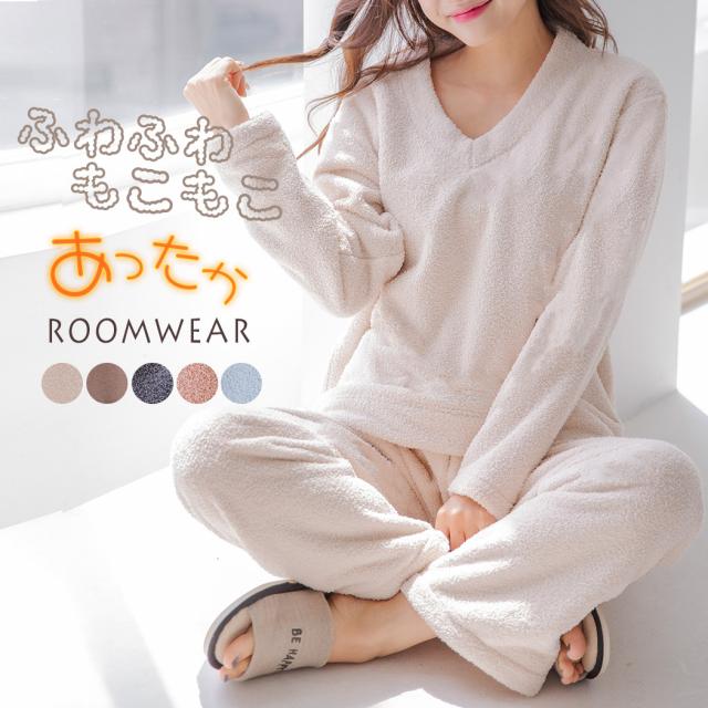 ルームウェア レディース 長袖 上下セット 起毛 ふわふわ もこもこ パジャマ Vネック セットアップ プルオーバー トップス パンツ 2点セット 前後 アシンメトリー ダブルフェイス 生地 ウエストゴム シンプル 防寒 秋冬