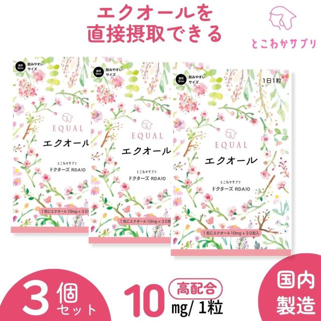 3個セット エクオール10mg 1粒で 30粒入 30日分 国内製造 S-エクオール 発酵大豆イソフラボン エクオールを直接摂取 産婦人科医監修 とこわかサプリ ドクターズ RDA10 agesugi_sbe