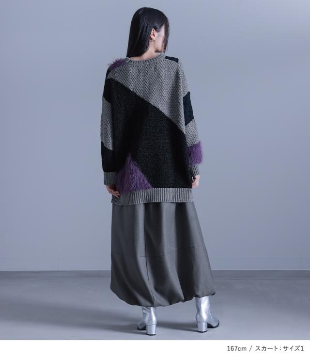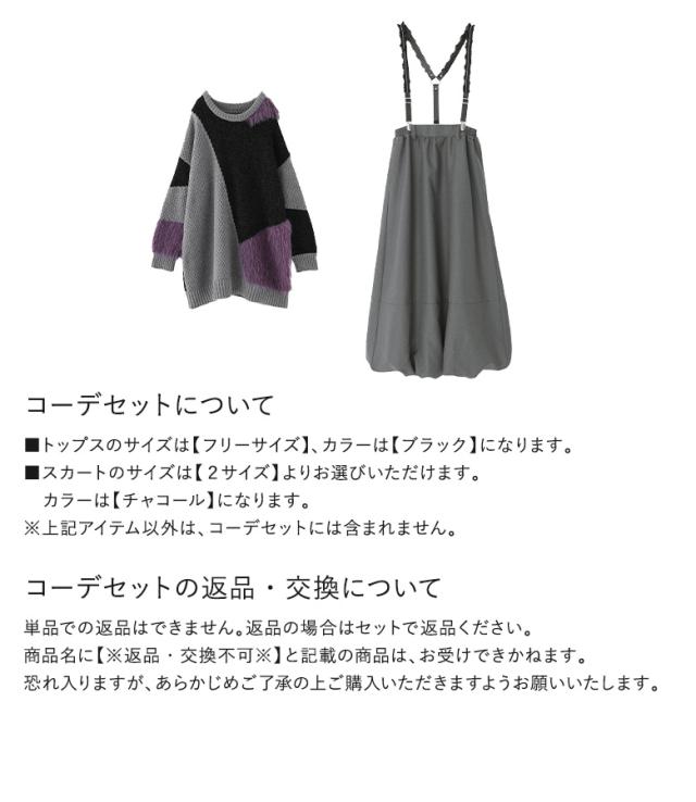 【送料無料】『切り替え配色モードシャギーニットトップス×サスペンダー付きバルーンスカートコーデ2点SET』【メール便不可】【70】[2点コーデセット 2024 レディース ニット 長袖 シャギーニット スカート ロング丈]