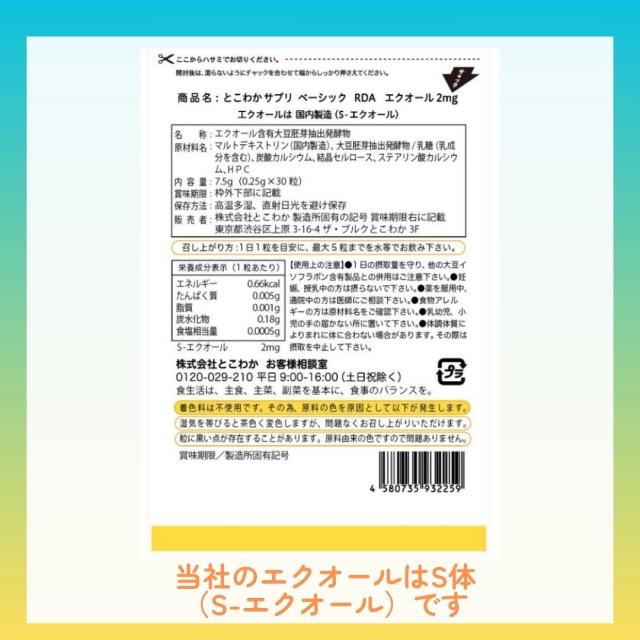 エクオール2mg 1粒で 30粒入 30日分 国内製造 S-エクオール 発酵大豆イソフラボン エクオールを直接摂取 とこわかサプリ ベーシック RDA2 agesugi_sbe