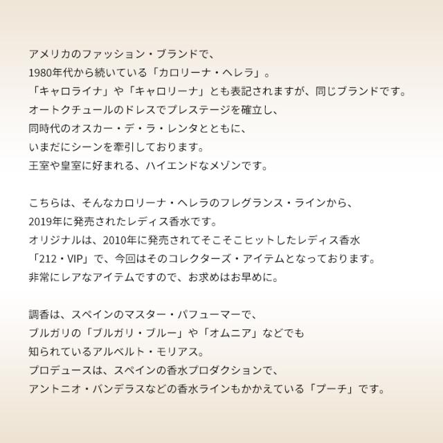オリジナルは、2010年に発売されてそこそこヒットしたレディス香水「212・VIP」で、今回はそのコレクターズ・アイテムとなっております。ボックスが飲料水の缶のようなデザインになっている以外は、オリジナルと変わりません。