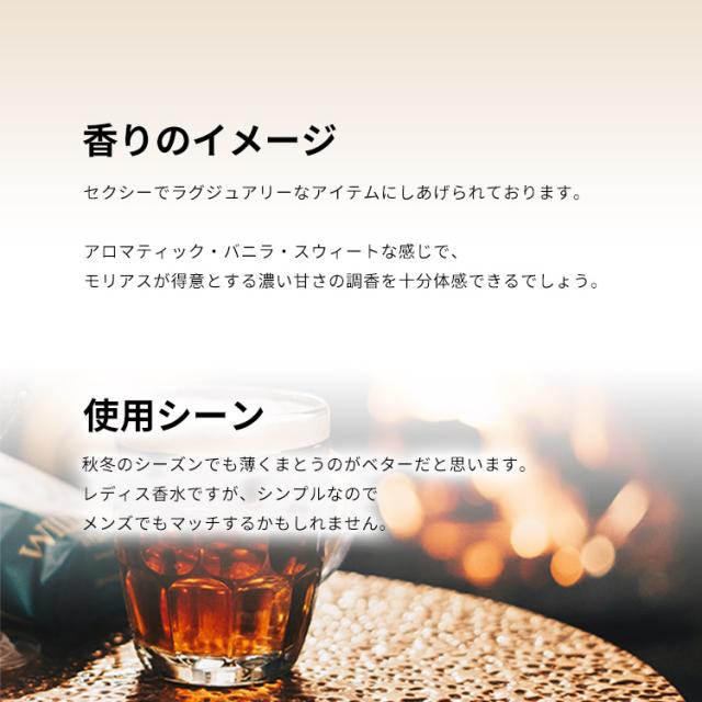 アロマティック・バニラ・スウィートな感じで、モリアスが得意とする濃い甘さの調香を十分体感できるでしょう。秋冬のシーズンでも薄くまとうのがベターだと思います。レディス香水ですが、シンプルなのでメンズでもマッチするかもしれません。