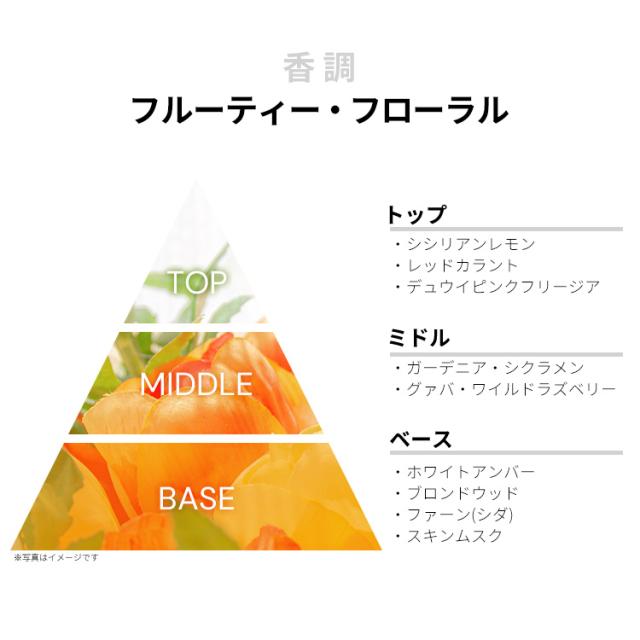 シシリアン・レモン、レッド・カラント、デュウイ・ピンク・フリージアなどが、スマートで洗練されたフルーティー・フローラルを香り立たせるトップから、