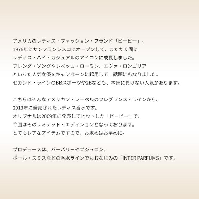 こちらはそんなアメリカン・レーベルのフレグランス・ラインから、2013年に発売されたレディス香水です。オリジナルは2009年に発売してヒットした「ビービー」で、今回はそのリミテッド・エディションとなっております。とてもレアなアイテムですので、お求めはお早めに。香りは都会的でポップなフルーティー・フローラルの香調がベース。ガーリーでオシャレなたたずまいに満ちた、ウェルメイドな一品に仕上げられております。