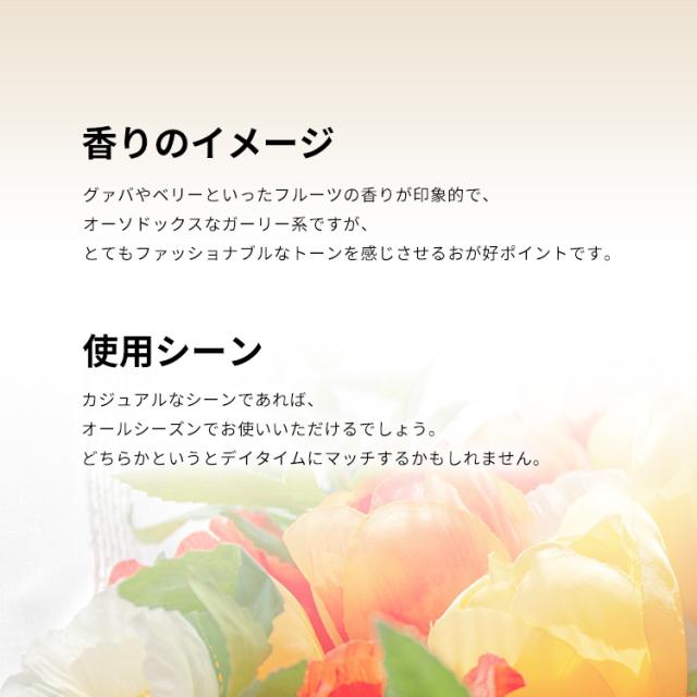 プロデュースは、バーバリーやブシュロン、ポール・スミスなどの香水ラインでもおなじみの「INTER PARFUMS」です。グァバやベリーといったフルーツの香りが印象的で、オーソドックスなガーリー系ですが、とてもファッショナブルなトーンを感じさせるおが好ポイントです。カジュアルなシーンであれば、オールシーズンでお使いいただけるでしょう。どちらかというとデイタイムにマッチするかもしれません。