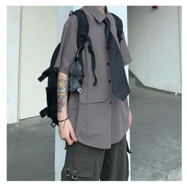 韓国 レディース ネクタイ付き 無地 半袖 ゆったり メンズ シャツ オーバーサイズシャツ 大きいサイズ 3way 秋服 春服 ビッグシルエット シャツ ファッション カジュアル ストリート カジュアルシャツ シャツ 秋服 秋 冬服