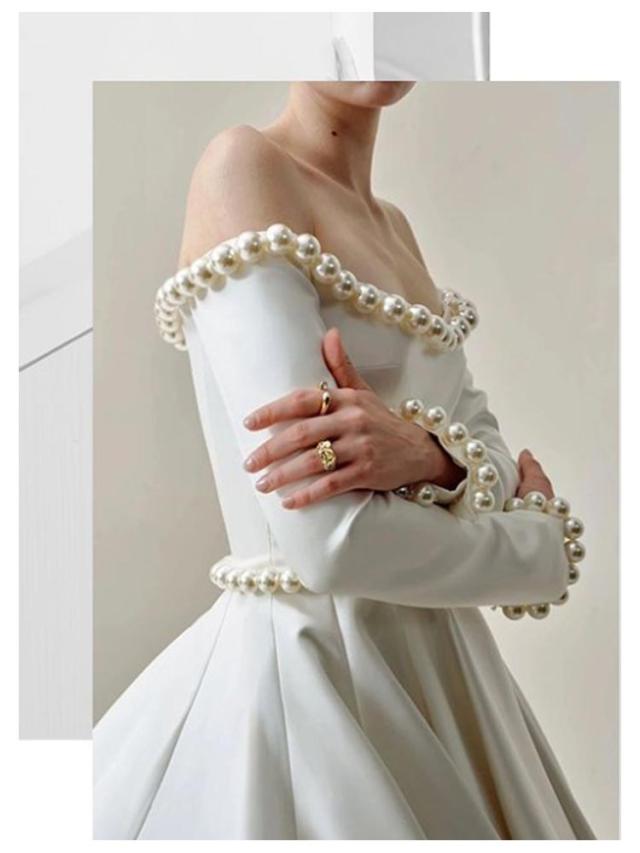 | パール調!オフショルダーでデコルテのラインが美しく見えます。 トレーンタイプもあり!後ろ姿も美しく、ロケーションフォトでも映えるデザインです。 シンプルなデザインなので大人っぽさを演出してくれます。 | |