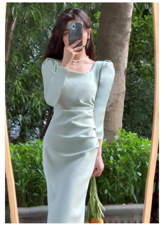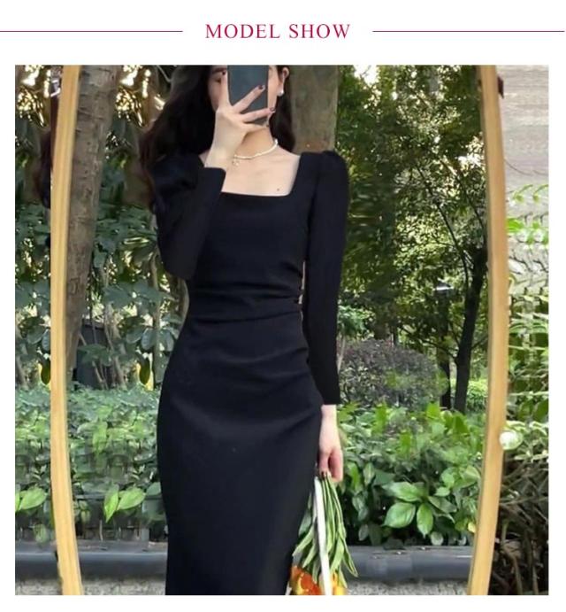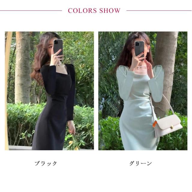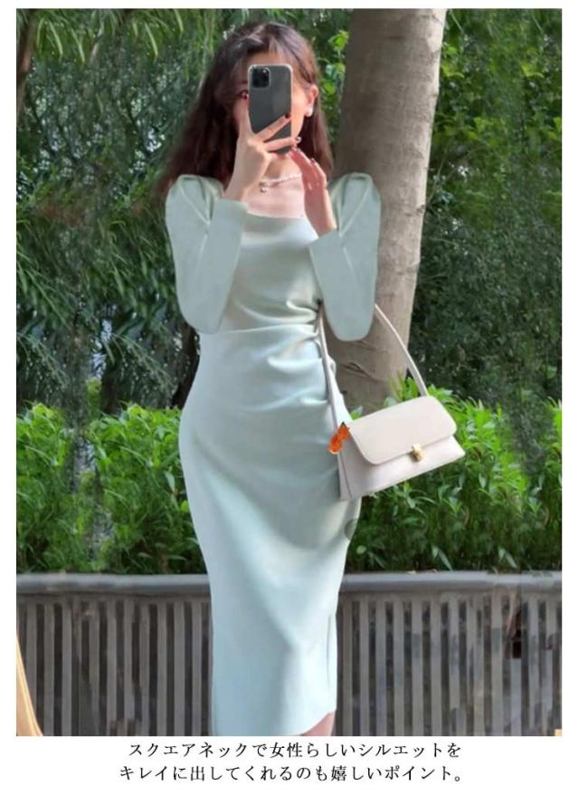 タイトワンピ スクエアネック ドレスワンピース タイト フォーマル ミニワンピース フォーマルワンピース タイト 長袖 ロングワンピース ひざ丈 パーティドレス 二次会 披露宴 お呼ばれ ミディアム丈 着痩せ 韓国ファッション S M L XL