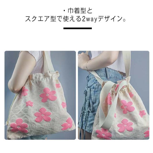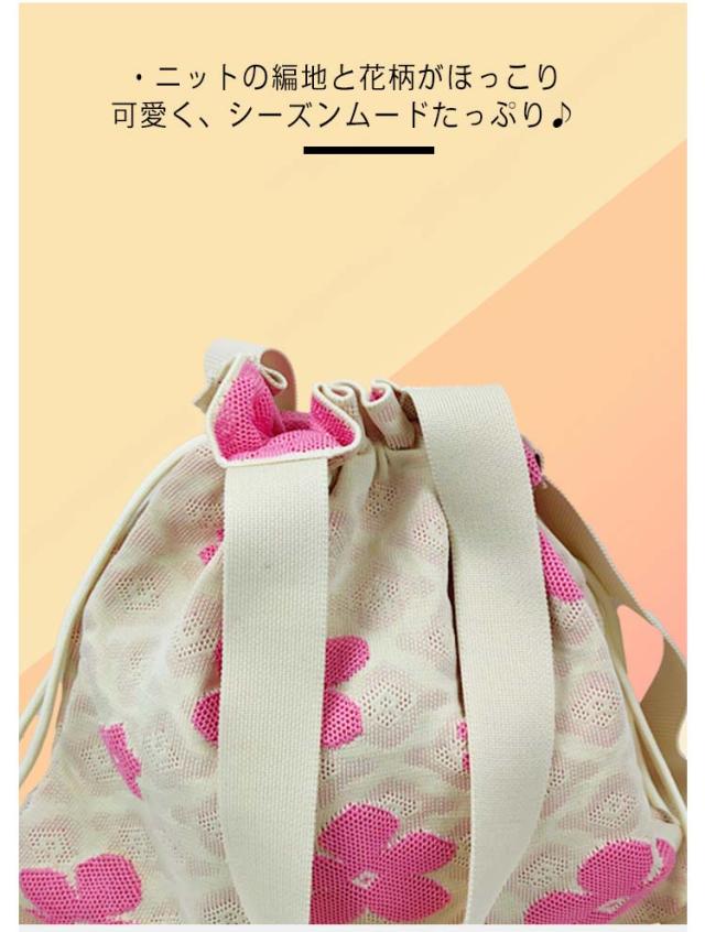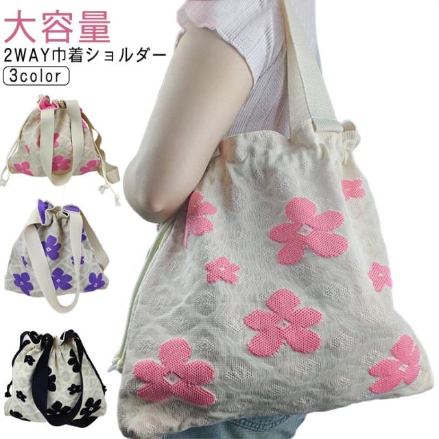 巾着ポーチ 花柄 トートバッグ ショルダー ニットバッグ 手提げ 2way 巾着バッグ ショルダーバッグ カジュアル 斜めがけ 大容量 肩掛け 旅行 軽量 かわいい 可愛い 洗える 浴衣