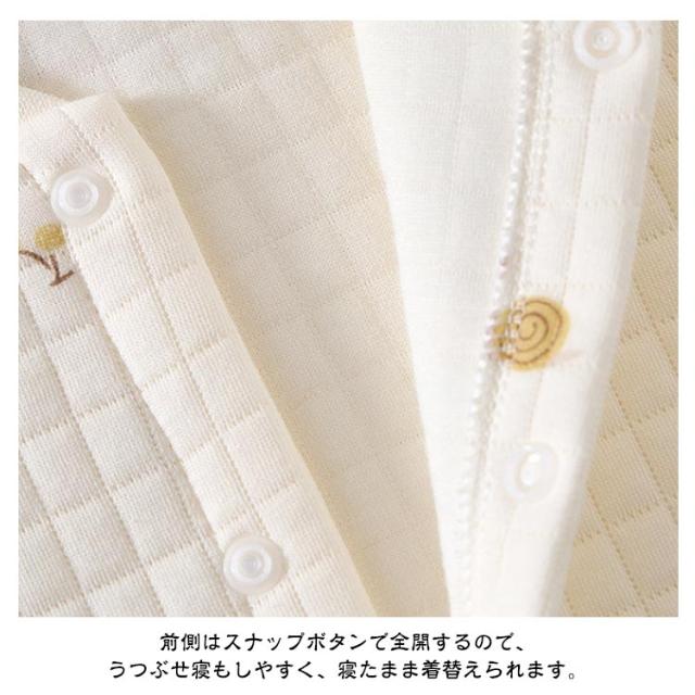 | 【59 66 73 80 90】【綿】【6color】 なめらかな肌触りの綿素材で心地よく着ていただけます。若干厚みのある素材なので、秋冬から春先、真夏以外がおすすめです。 前側はスナップボタンで全開するので、うつぶせ寝もしやすく、寝たまま着替えられます。股下が全開にできるのでお着替えもおむつ替えもラクです。袖口と裾口がリブ仕様になっており、肌寒い秋口から冬の時期に寒さから赤ちゃんを守ります。 お部屋着やお誕生日・記念日・出産祝い・お祝いギフトなどにぴったりちクリスマスや新年プレゼントも完璧。 | |