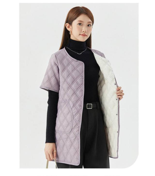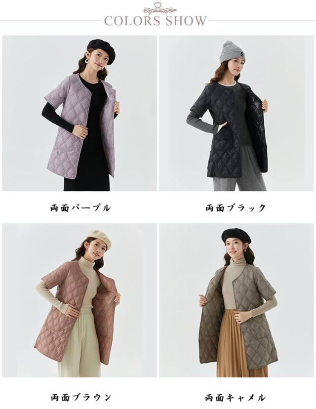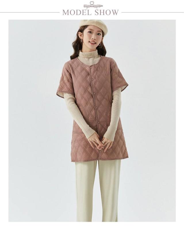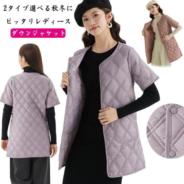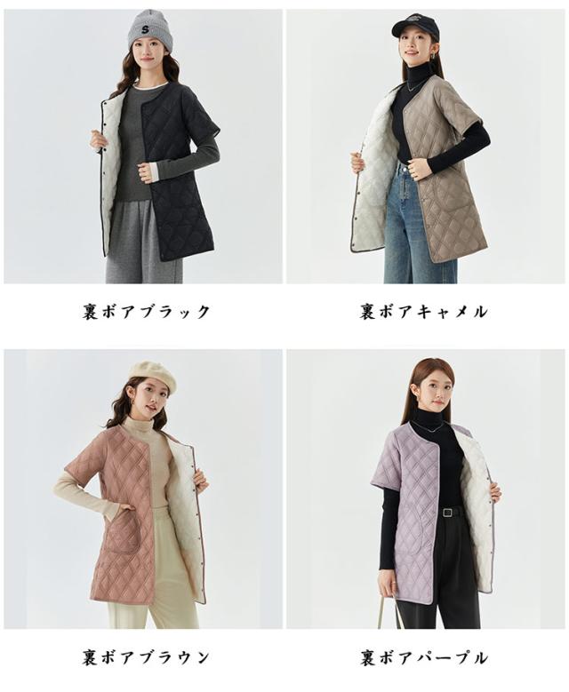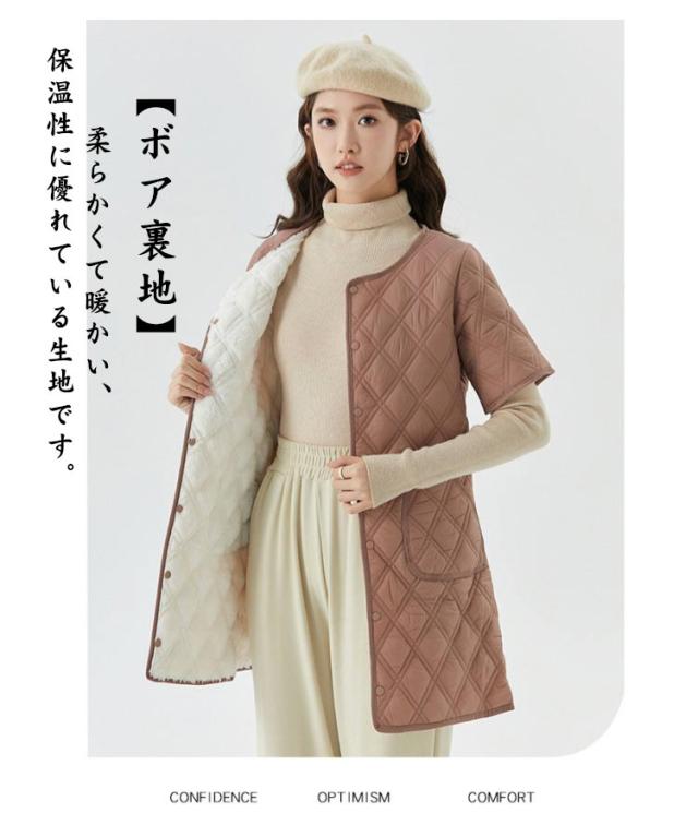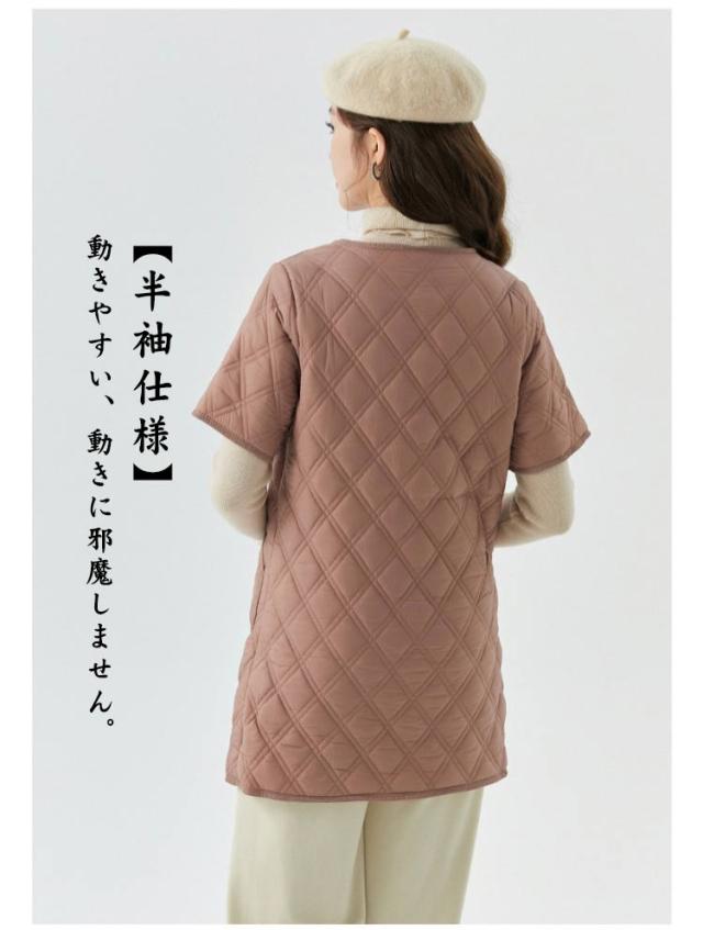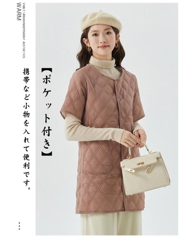 半袖ジャケット 中綿ジャケット レディース ダウンジャケット インナー ミドル丈 裏ボア 裏起毛 軽量 シンプル ポケット付き 保温 防寒 暖かい あったか カーディガン アウター 寒さ対策 冷え対策 仕事 事務所 部屋着 重ね着 シニア 年寄り 高齢者