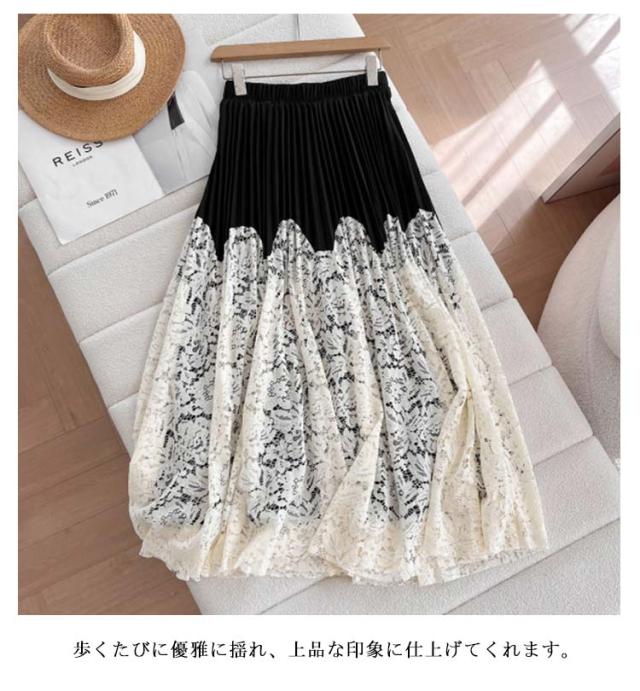 プリーツスカート 大人 ロングスカート Aラインスカート レーススカート レース切り替え ひざ下 膝下 レース切り替え マキシスカート 裏地 付き 体型カバー フレアスカート きれいめ 大人カジュアル フェミニン おしゃれ