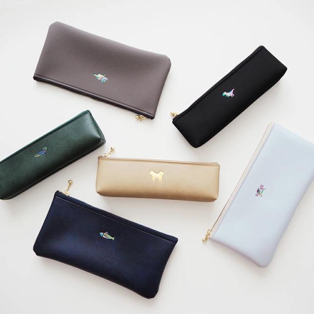 動物のワンポイントモチーフを箔押しであしらったフラットペンケース