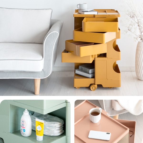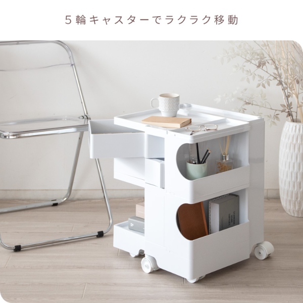 180度回転するスライドトレイやポケット収納など、4種類の収納スペースがあり、リビングや寝室、デスクなど色々なシーンでマルチにお使いいただけます。ベビー用品の収納にもオススメ。5輪キャスターでラクラク移動できます。