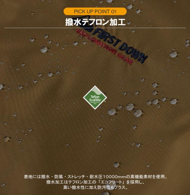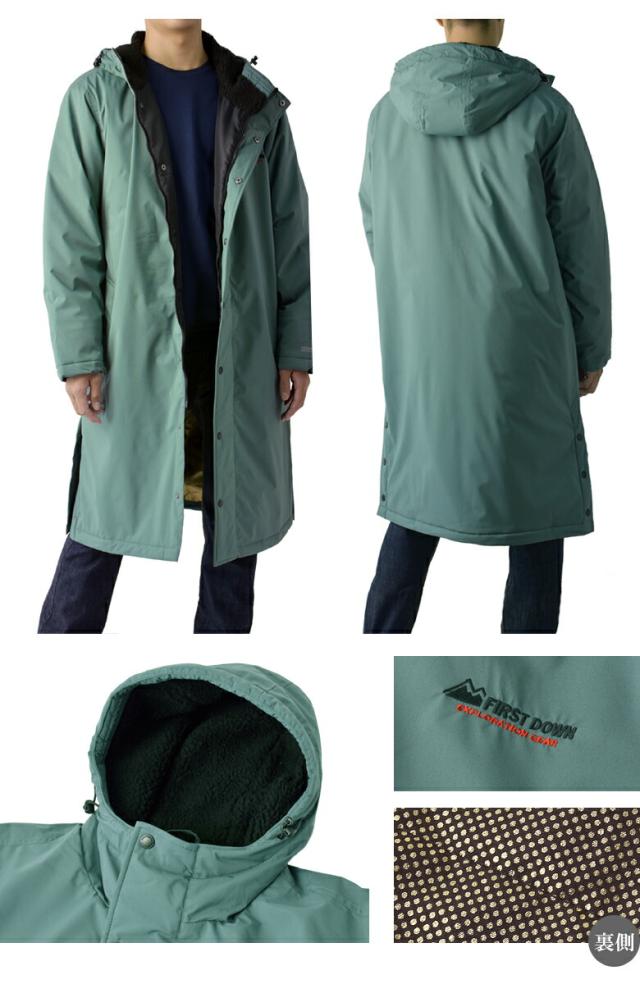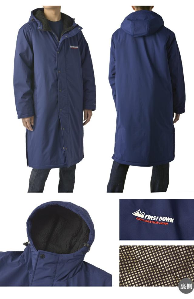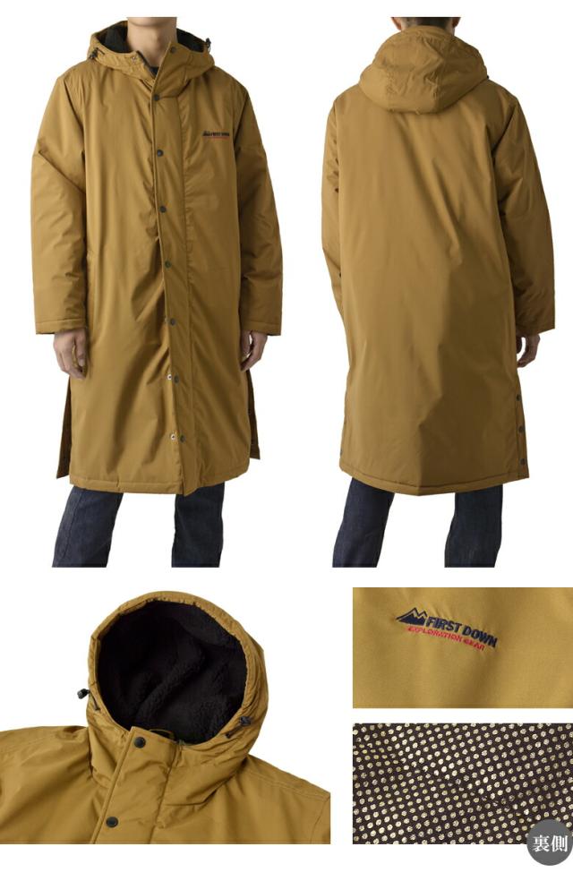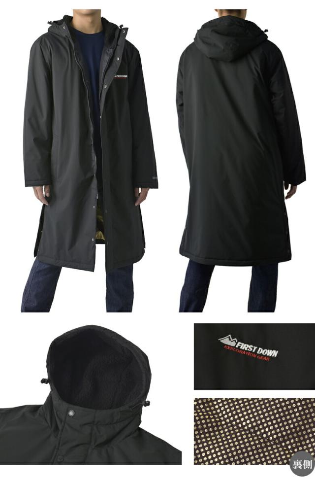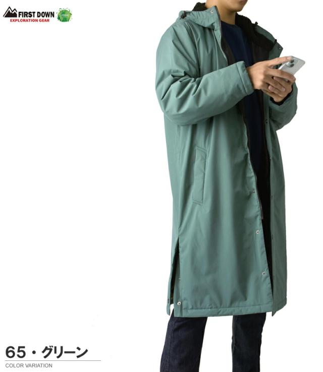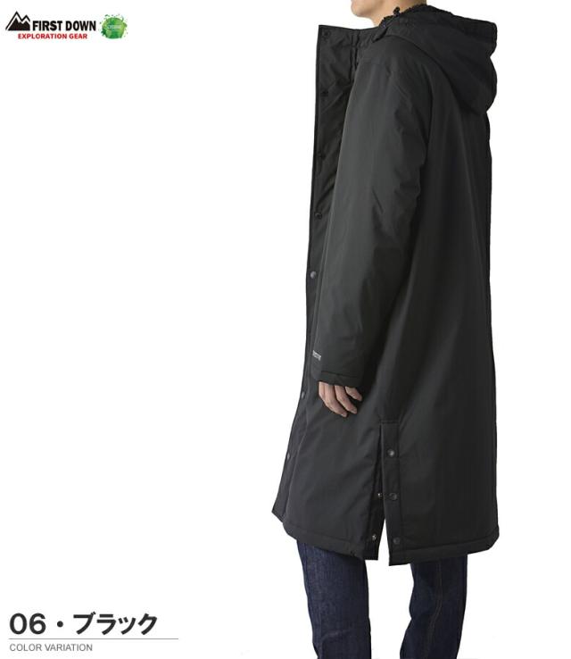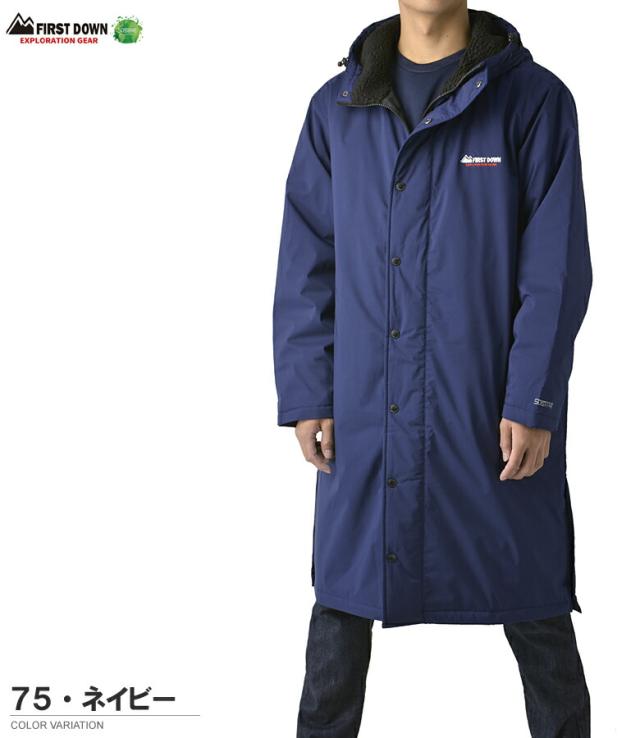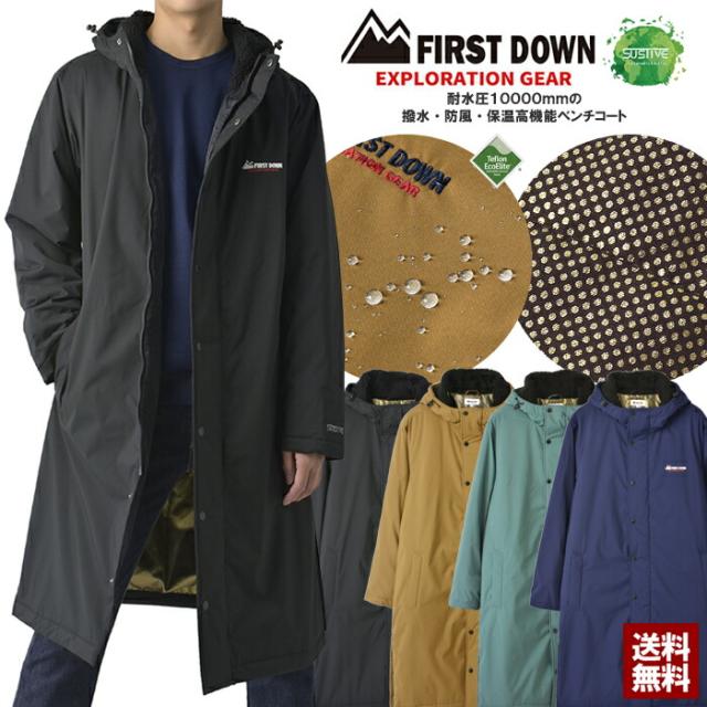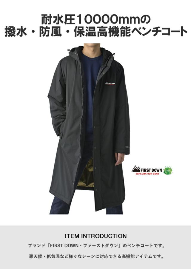 FIRSTDOWN ファーストダウン メンズ 保温 撥水 防風 ストレッチ 耐水圧10000mm ベンチコート アルミプリント 中綿 ボアフード ロング丈 ロングコート テフロン加工 オールウェザー サスティナブル 正規品【C2H】
