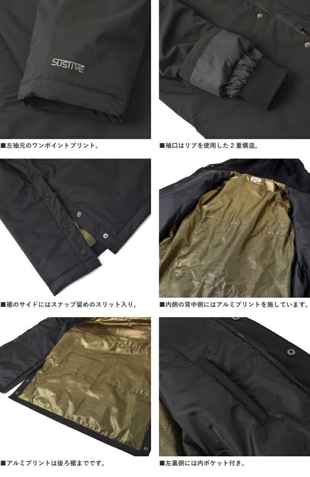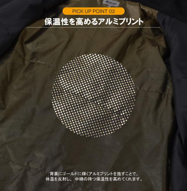 | 表地:ポリエステル100%(裏側にポリウレタン樹脂コーティング加工) 裏地(前身頃部分・背裏部分・フード裏・中わた):ポリエステル100% 裏地(リブ部分):ポリエステル95% ポリウレタン5% |