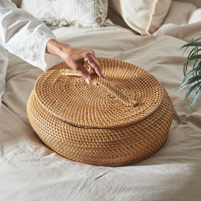 ラタンバスケット 浅型 バスケット 収納かご 蓋付き アジアン雑貨 収納 ラタン カゴ スリッパ収納 お菓子入れ おしゃれ バリ島 かごバスケット 14175