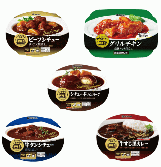 【レトルト】伊藤ハム レンジでごちそう グリルチキン 牛タンシチュー ビーフシチュー赤ワイン仕立て 牛すじ黒カレー シチュー・ド・ハンバーグ 5個セット 関東圏送料無料