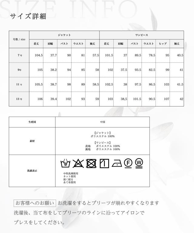 軽やかな美しさ ロングジャケットとプリーツワンピースが織りなす美しいアンサンブル すらっとしたロング丈ジャケット、すらっとした落ち感 体のラインを拾わず綺麗なシルエットの体型カバーが叶うフォーマル ノーカラーデザインにすっきりとしたディティールが相まって軽やかで上品な印象に 裾まで伸びるプリーツ 縦長ラインの視覚効果ですらっと華奢魅せ 一人で着用が簡単な前開きワンピース 左側の襟元にファスナーが隠されてデザインを邪魔しない仕様 濃染加工を施した深い黒のブラックフォーマル専用生地 手洗い可能ですので使いたい時にすぐに準備ができる嬉しい仕様 ※お客様へのお願い お洗濯をするとプリーツが崩れやすくなります。 洗濯後、当て布をしてプリーツのラインに沿ってアイロンでプレスをしてください。 コサージュに合わせて卒業式に、一生の思い出となる特別な1日を、上品に、そして華やかに彩る ・袖はターンバックできるスリット入り ・留やすい大きめのホック ・夏でも一枚で着られる七分袖は安心感のある透けない素材 ・ジャケットからワンピースが出ないように計算された型紙 ・ワンピースの上見ごろは肌触りの良いサップ素材 キーワード:喪服 礼服 ブラックフォーマル アンサンブル ワンピーススーツ プリーツワンピース ロング丈ジャケット ロングジャケット お通夜 葬儀 葬式 お別れの会 偲ぶ会 20代 30代 40代 50代 おしゃれ かわいい 上品 |