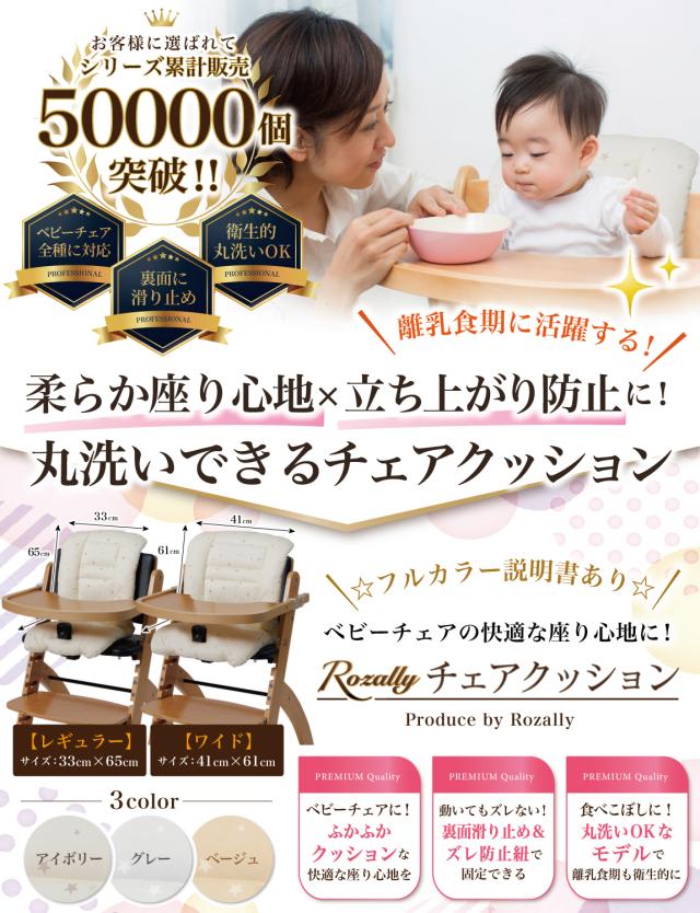 Rozally チェアクッション がついに正式販売開始。 「ベビーチェアの固い座面にクッションが欲しい…」というお客様の声から生まれた 「ベビーチェア」「ハイチェア」「ローチェア」 に対応したチェアクッションです。 柔らかな座り心地に加えて、背中も背もたれクッションで覆って 頭をぶつけても痛くないよう進化しています。 企画&設計では 離乳食期の乳幼児 育児に詳しい 【保育士】の先生からアドバイスをもらい、 衛生的に使えるよう丸洗い可能な素材選定を行いました。 シンプルで可愛いデザインに仕上げたため出産祝いなどギフトにも最適になっています。 |