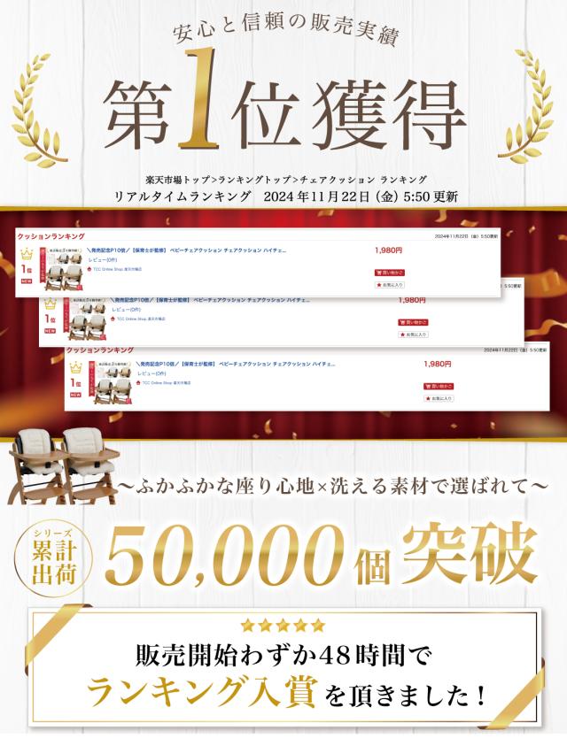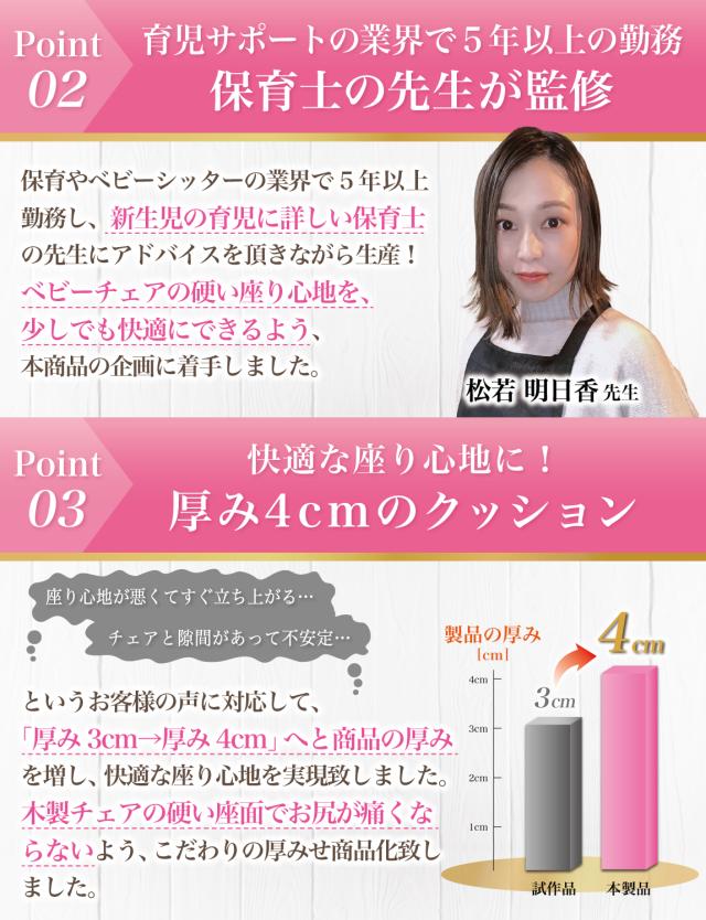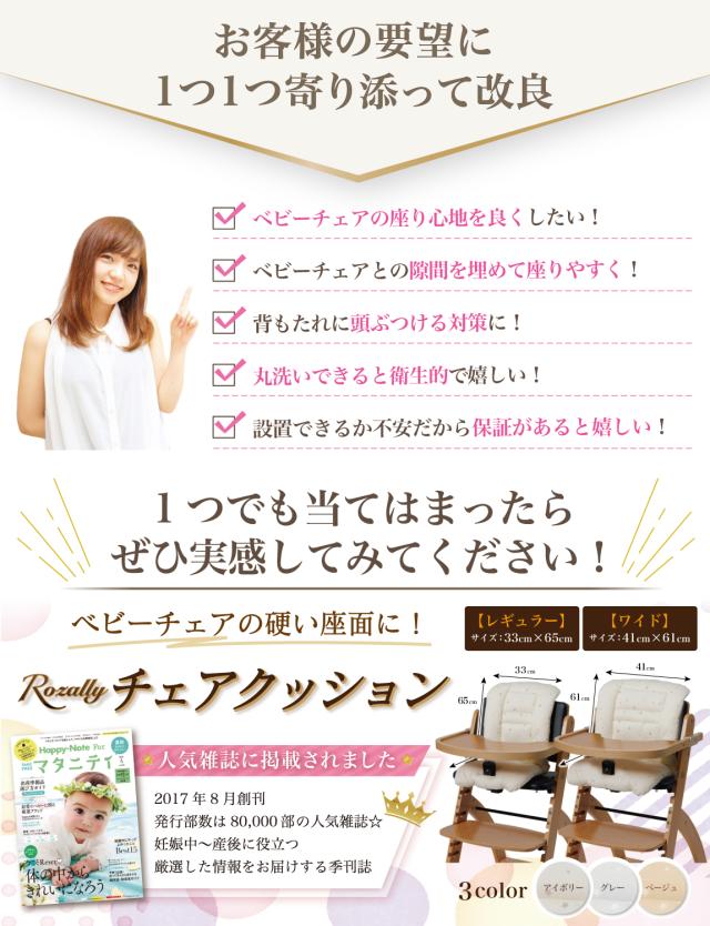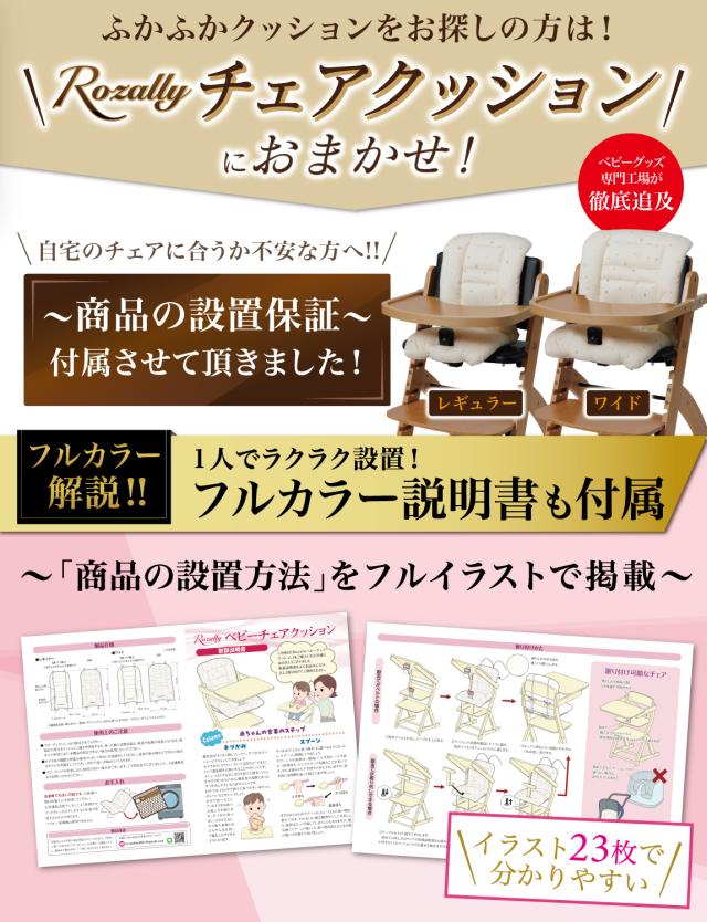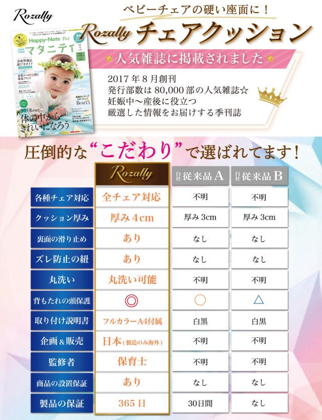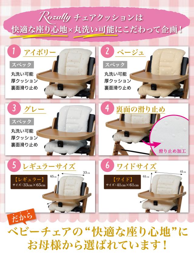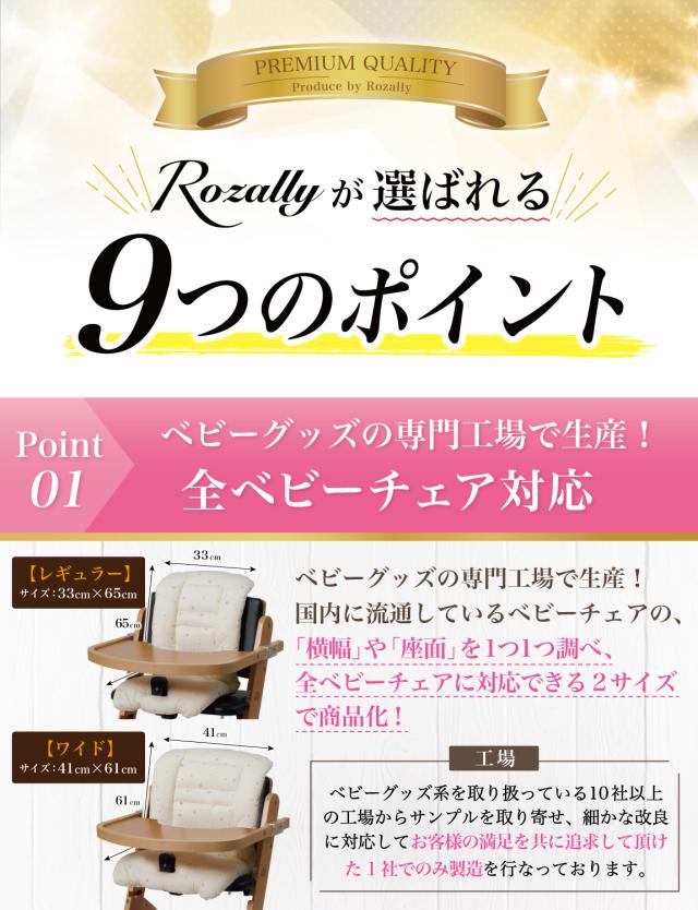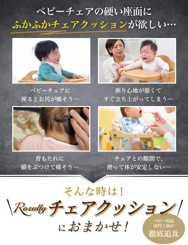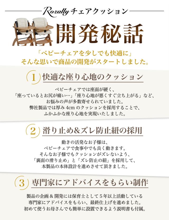 様々なメーカーから ベビーチェアクッションや ベビーチェア用クッション として ” チェアクッション ”が販売されていますが、Rozallyの チェアクッション は ”こだわり”が一味違います。 赤ちゃん用品をメインに取り扱っている10社以上の工場からサンプルを取り寄せ、 「快適な座り心地×底面の滑り止め加工」を一緒に試行錯誤して頂けた 1社に絞って発注を行なっています。 |