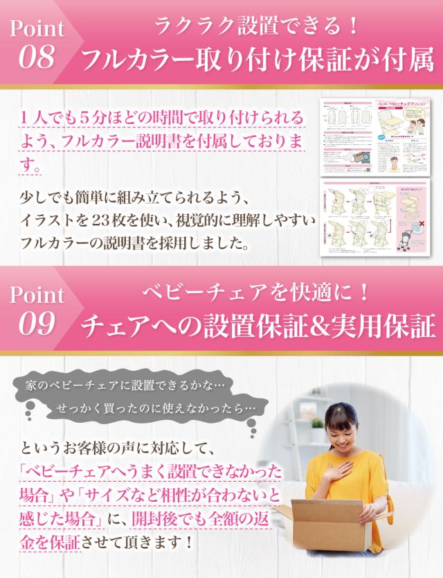 Rozally ベビーチェアクッションは品質にこだわり、 工場と交渉をおこなって素材選定から進めています。 出荷前の検品などは十分に行わせて頂いているのですが、 輸送中に破損や汚れは混じってしまうケースがあります。 不具合などが発生してしまった場合でも、 製品には1年間の長期保証を付属させて頂いておりますので、 すぐに交換品の手配をさせて頂きます。 また本製品には使いやすさや快適さを実感して頂くことを最優先に考え、 「2週間ほど使ってみたが座り心地が不満そう…」という場合に、 ”開封後”でも”使用済み”でも全額の返金保証を付属させて頂いております。 |