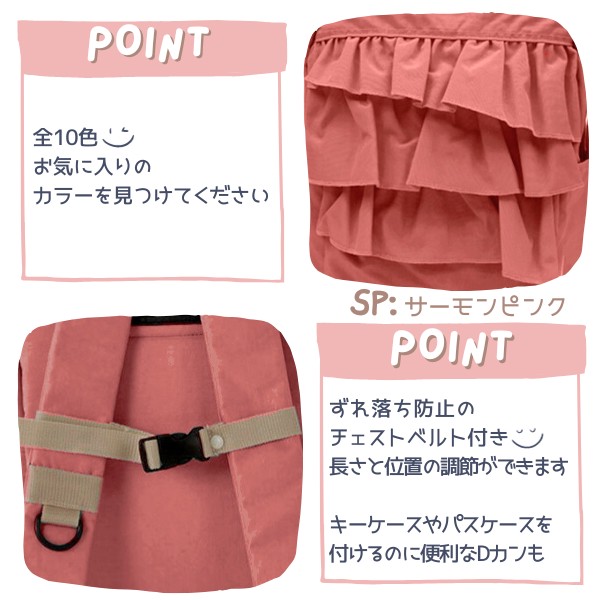 軽量 軽い 柔らかい 使いやすい 機能的 丈夫 ブランド ロゴ ワンポイント カラフル かわいい キュート CUTE おしゃれ お洒落 ガーリー シンプル プレーン 無地 チェストベルト ハーネス ベルト ネームホルダー 名前ホルダー フリル レース ギャザー ひらひら ふりふり 人気 売れ筋