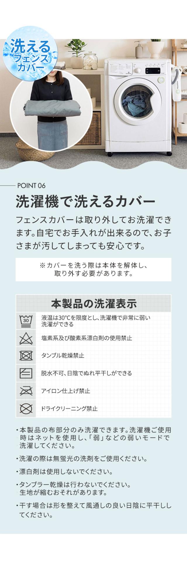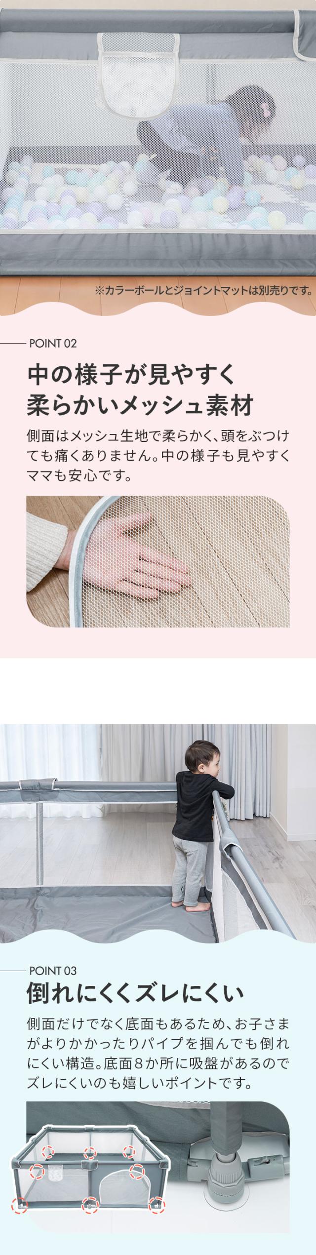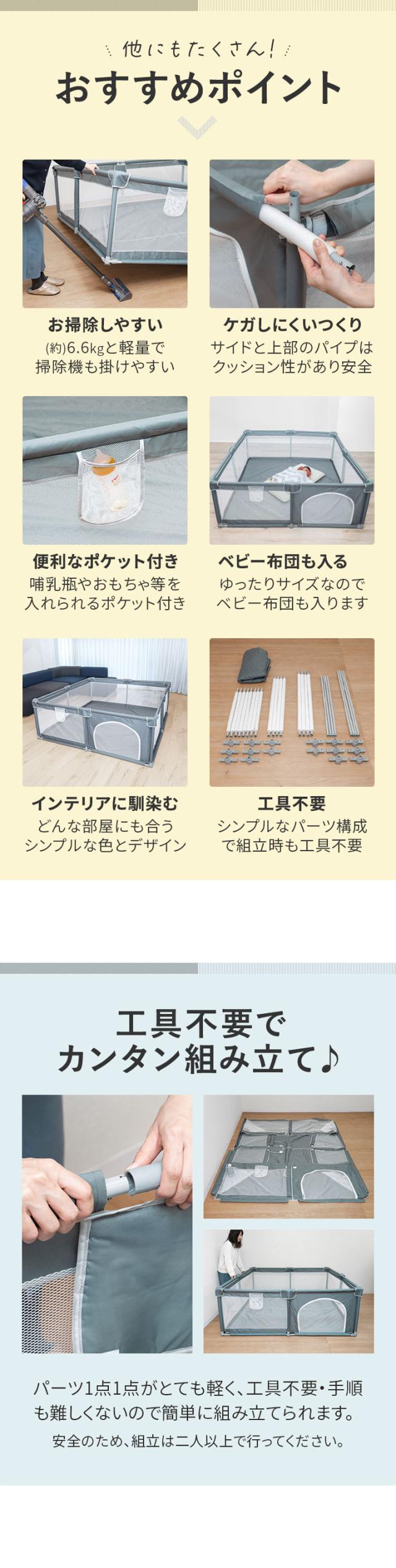 特記事項: 【禁止】 ・勝手に改造したり、他メーカーの部品を代用しないでください。 ・ストーブやヒーターなど火気の近くで使用しないでください。やけどや火災の原因となります。 ・電源コードなど足をひっかけるおそれがあるものの近くで使用しないでください。 ・本製品内に、紐など首を締めてしまうおそれがあるもの、おもちゃなど誤って飲み込むおそれがあるものを入れないでください。 ・落下やけがの原因となりますので、本製品内にお子様が容易に登れる踏み台のようなものを置かないでください。 ・本製品に腰をかけたり、ぶら下がったり、揺らしたりしないでください。 ・万が一、破損・欠損などがあった場合は絶対に使用しないでください。 ・ネットを緩ませた状態で使用しないでください。 ・使用中はお子様から絶対に目を離さないでください。 【注意】 ・使用する前に、本体及び付属部品に破損・欠損などが無いか、必ずご確認ください。 ・近くにお子様がいない状況で、必ず保護者の方が組み立ててください。また、完全に組み立ててから使用してください。 ・平坦かつ周囲に危険物のない安全な場所で使用してください。 ・使用するうちに連結部が緩んでくることがあります。定期的に点検し、緩み等があればメンテナンスしてください。万が一ひびや割れなどの異常があった場合は使用を中止してください。 |