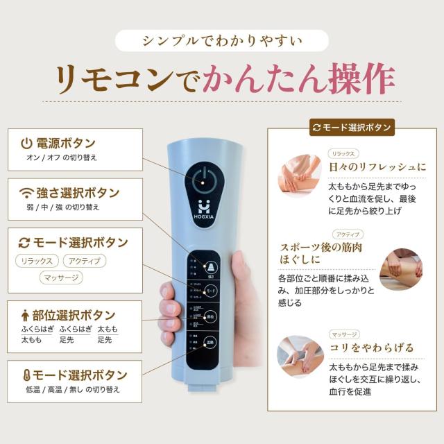 ふくらはぎ・太もも・足先の部位選択と、3種類のモード選択でスッキリ気分爽快
