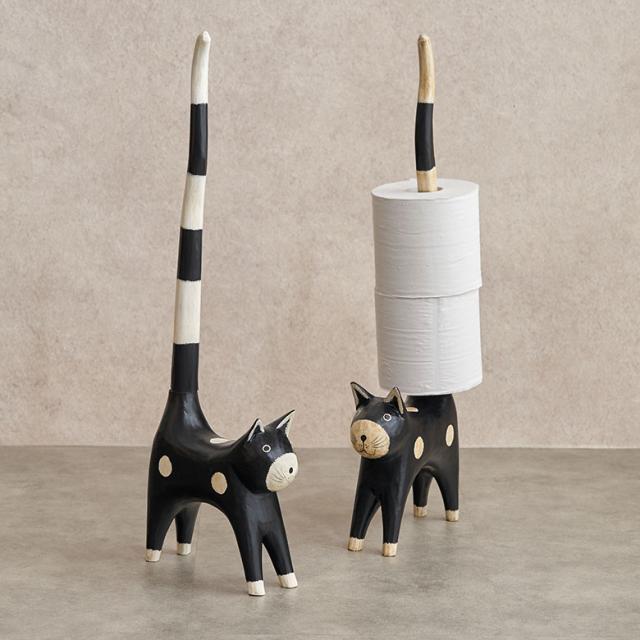 天然素材アルベシアウッドを使用したバリネコのトイレットペーパーホルダー。ほのぼのとした癒し度バツグンのおとぼけ顔と、ぴーんと真上に伸びた長い尻尾がチャームポイント。黒いボディに白のまんまるなドットをつけて可愛く仕上げました。すべて手作業で作られているため形やペイントには1点1点個性があり、ハンドメイドならではの温かみを感じられます。トイレだけでなくオブジェのようにリビングや玄関などに飾って、インテリアとして楽しむのもおすすめです。