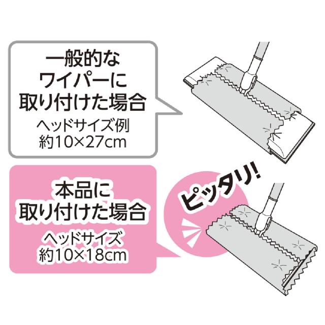 一般的なフローリングワイパーのヘッドに使い捨てマイクロファイバークロスを取り付けた場合、ヘッドの方が大きいため、ヘッドがはみ出てしまいます。しかし、本商品はヘッド幅を約18cmに設定することで、使い捨てマイクロファイバークロスに最適なサイズになっています。