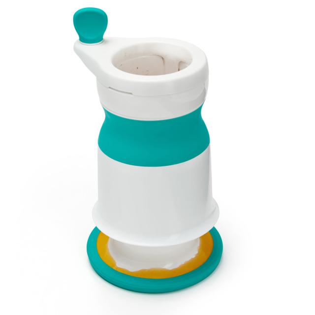 ハンドルを回すだけで、簡単に離乳食の準備ができるベビーフードミル(離乳食ペーストメーカー)です。野菜やおかずを入れて水分量を調整し、ハンドルをくるくる回せば完成です。できた離乳食は、開口部からスプーンですくうことができます。