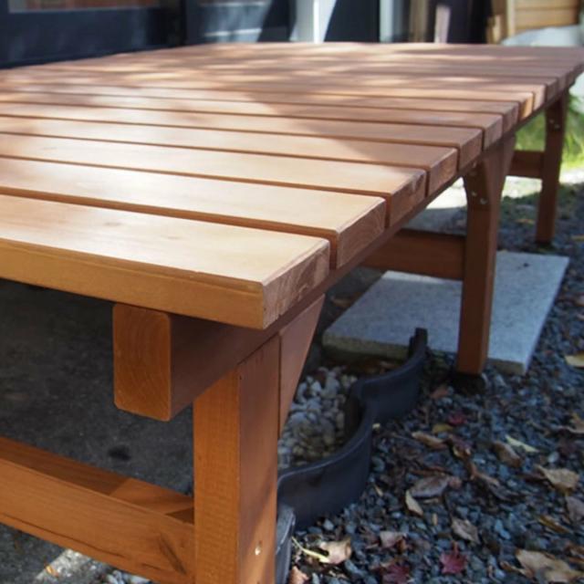 天然木素材を使用した縁台は、夏は熱すぎず冬は冷たすぎず、やわらかな座り心地が魅力です。おしゃれと実用性を兼ね備えており、天板厚は充分な厚みのある約2.5cmで、たわみも少なく安定した座り心地です。