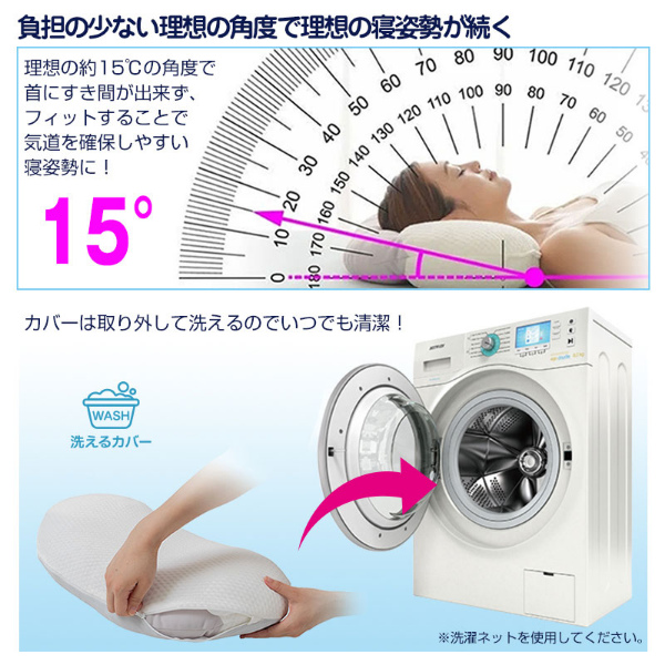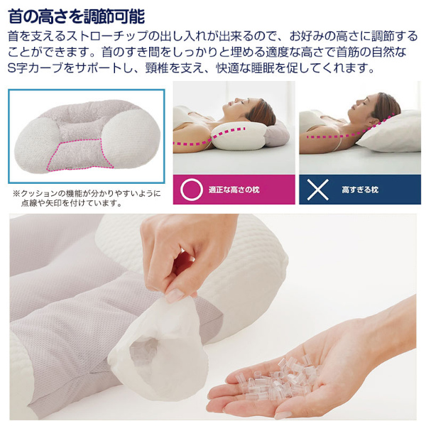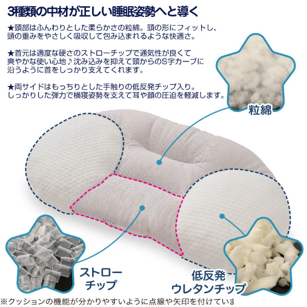 3種類の中材が正しい睡眠姿勢へと導く。■頭部:ふんわりとした柔らかさの粒綿。頭の形にフィットし、頭の重みをやさしく吸収して包み込まれるような快適さ。■首元:適度な硬さのストローチップで通気性が良くて爽やかな使い心地♪沈み込みを抑えて頭からのS字カーブに沿うように首をしっかり支えてくれます。■両サイド:もっちりとした手触りの低反発チップ入り。しっかりした弾力で横寝姿勢を支えて耳や顔の圧迫を軽減します。●頭を安定させる「くぼみ」形状。枕本体にある「くぼみ」が頭の位置が安定させてくれます。この「くぼみ」と中材のふんわりやわらかい粒綿が、後頭部の丸みに合わせてフィットします。●横寝をサポートする程よい高さの両サイドクッション。両サイド部分は肩の厚みを考慮し横向きでも気道の圧迫や肩に負担がかかりにくい高さで作られています。首から背筋が真っ直ぐになり自然な寝姿勢をキープすることができます。●首の高さを調節可能。首を支えるストローチップの出し入れが出来るので、お好みの高さに調節することができます。首のすき間をしっかりと埋める適度な高さで首筋の自然なS字カーブをサポートし、頸椎を支え、快適な睡眠を促してくれます。