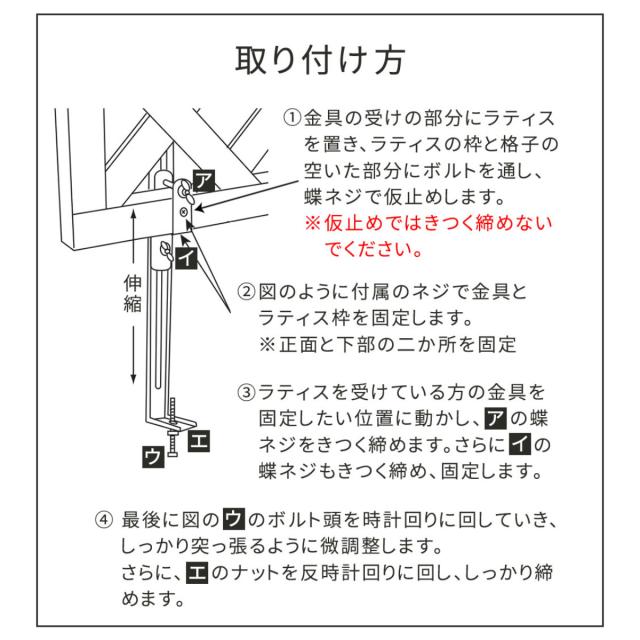 お庭やベランダ、店舗、公園などに、ラティスやフェンスを自作できる金具シリーズです。空間を仕切るだけでなく、日よけや、ディスプレイのベースとしても活用でき、DIY初心者さんでも簡単に設置できます。