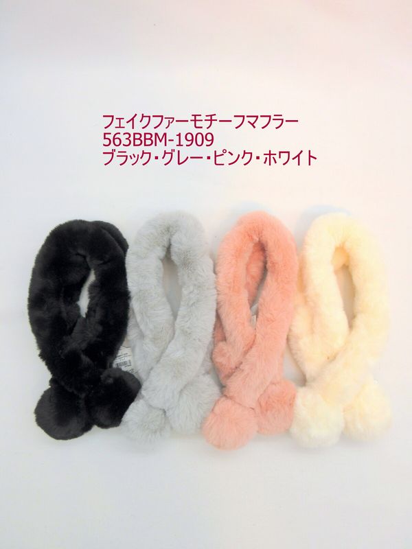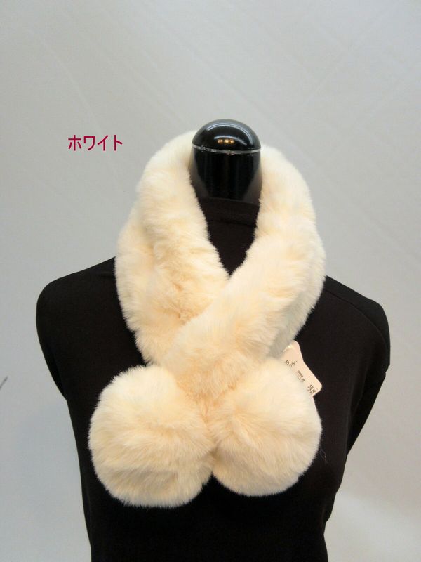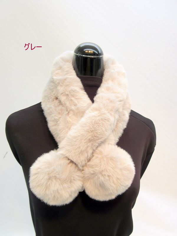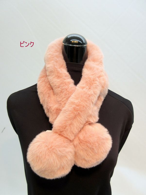 ふわふわの手触りが特長のフェイクファーモチーフマフラーはシンプルで使いやすいデザイン。両端の丸いポンポンがポイントです。